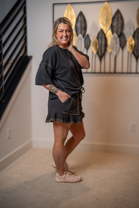 Effortless Edge Washed Ruffle Hem Shorts – Charcoal – Easel