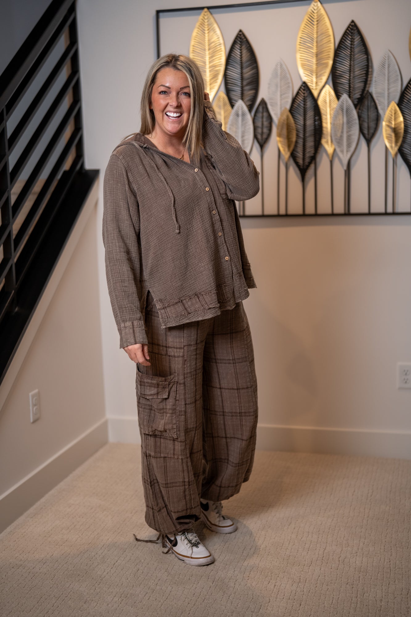 Easygoing with a touch of rustic charm, this Plaid Mineral Washed Hoodie is made for laid-back days and cozy layering. Crafted from lightweight, washed 100% cotton, it features a soft textured feel and relaxed fit with dropped shoulders for that perfectly lived-in look. The contrast plaid pattern adds effortless boho character, while the hooded button neckline, buttoned cuffs, and front chest pocket bring thoughtful detail.