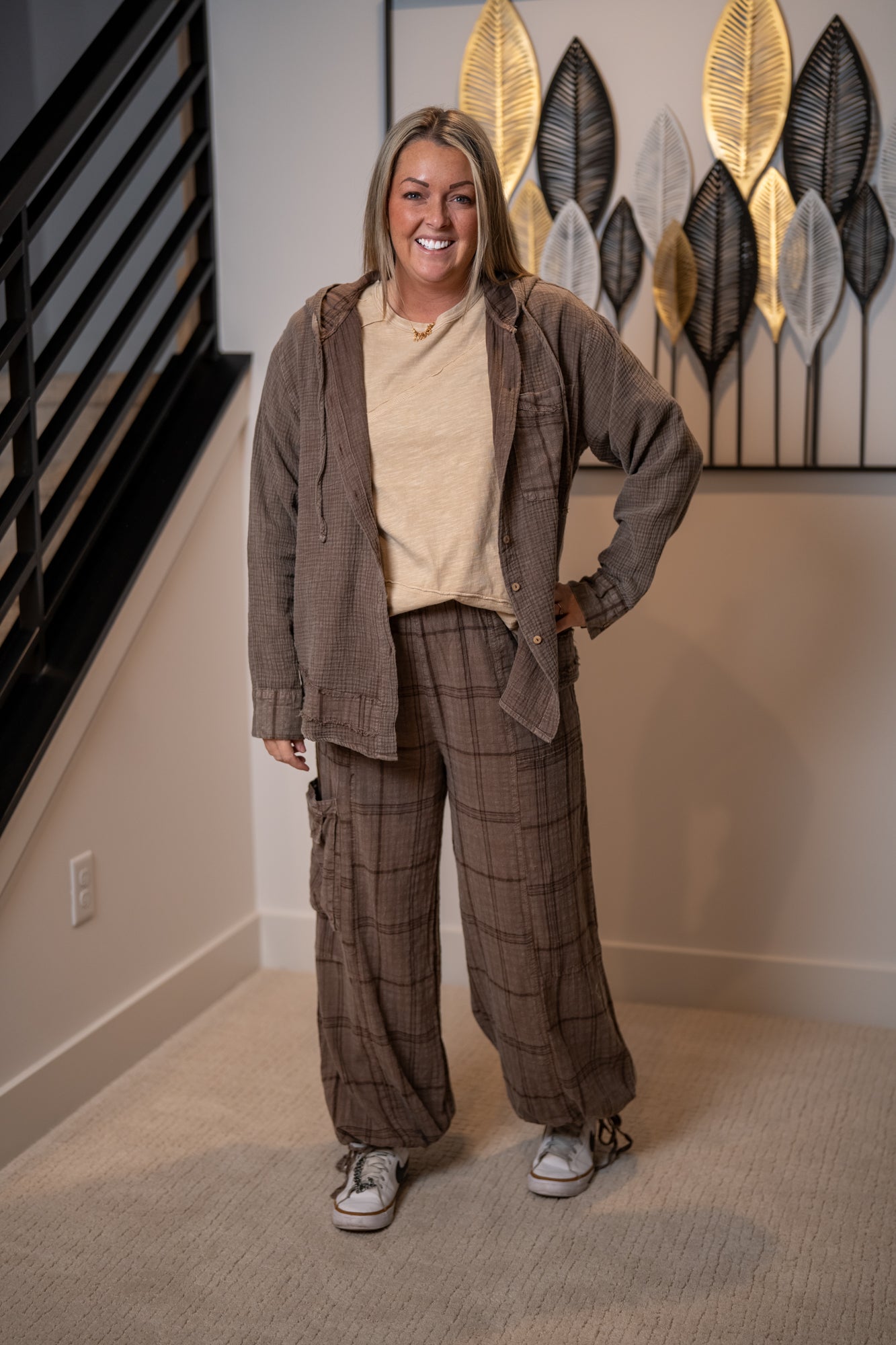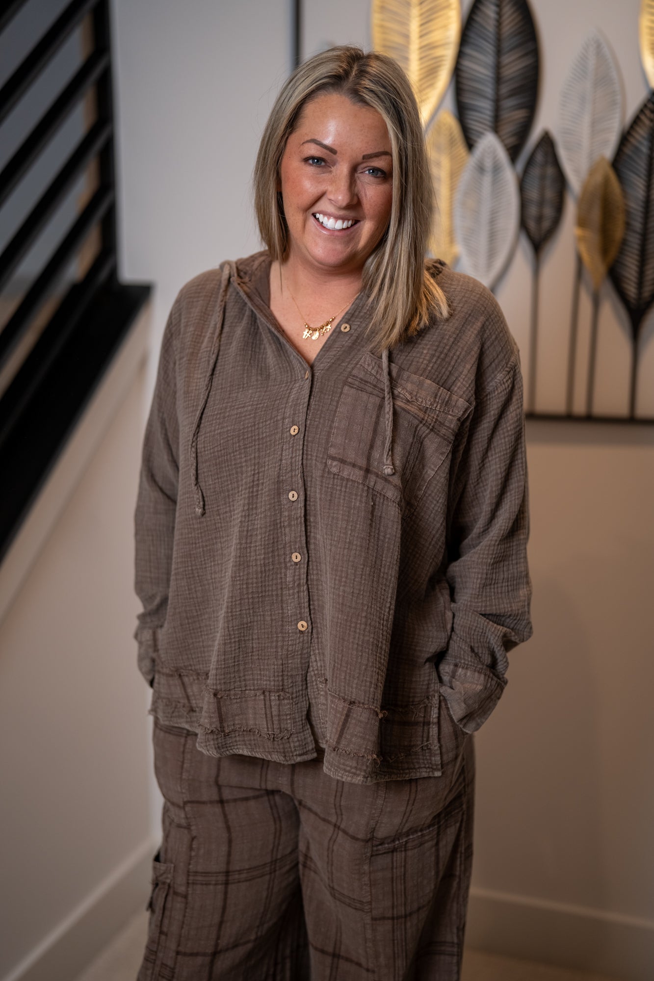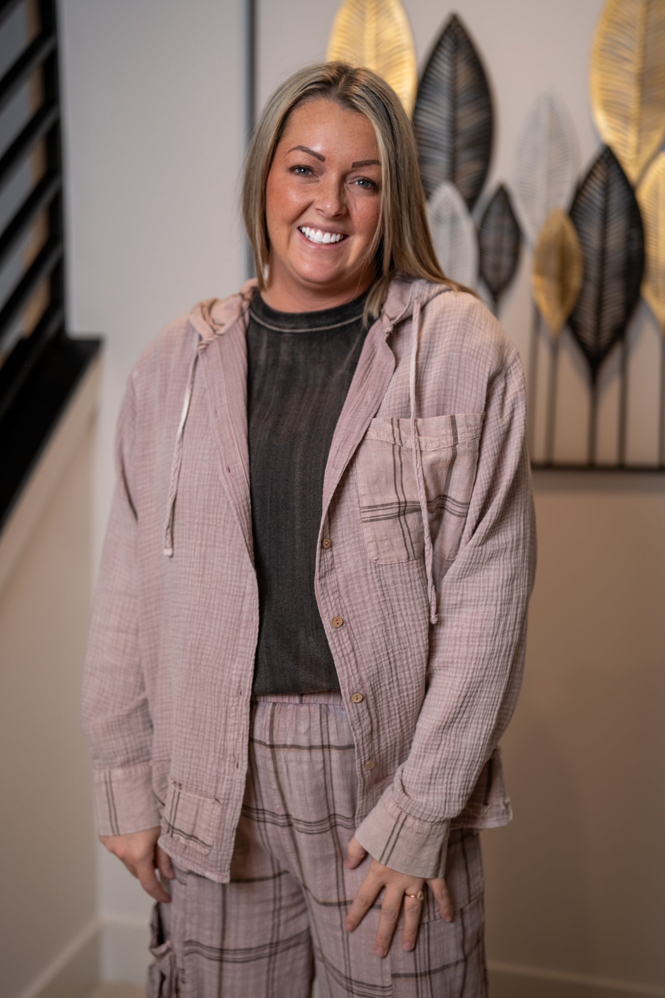 Finished with an attached drawstring hood, this versatile piece pairs beautifully with the Easel Plaid Mineral Washed Pants for a coordinated boutique set.