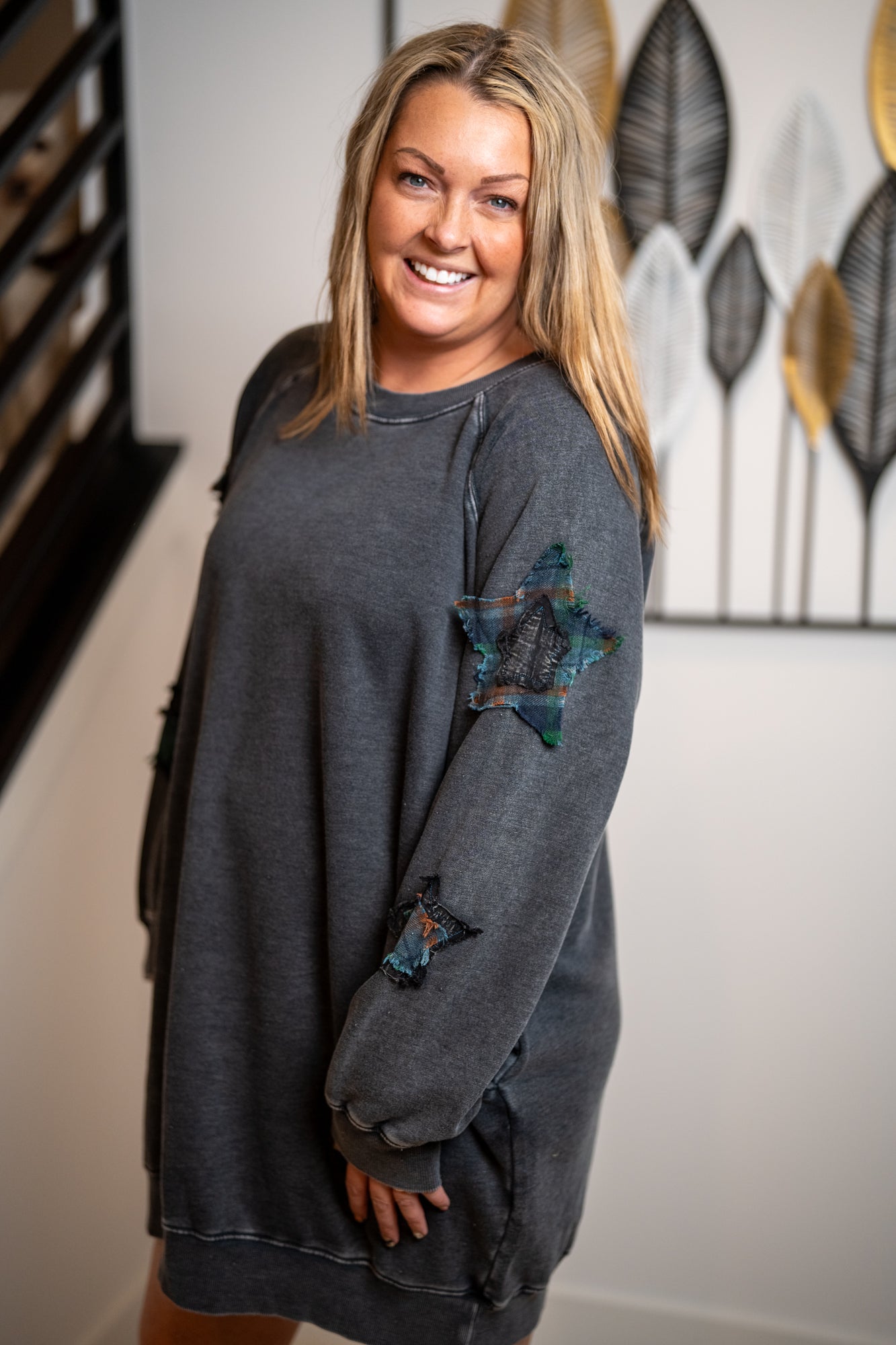 Featuring a classic crew neckline, knee-length silhouette, and side pockets for added functionality, it’s the perfect blend of comfort and style. The standout plaid star patch detail adds a playful, eye-catching touch that sets this dress apart.