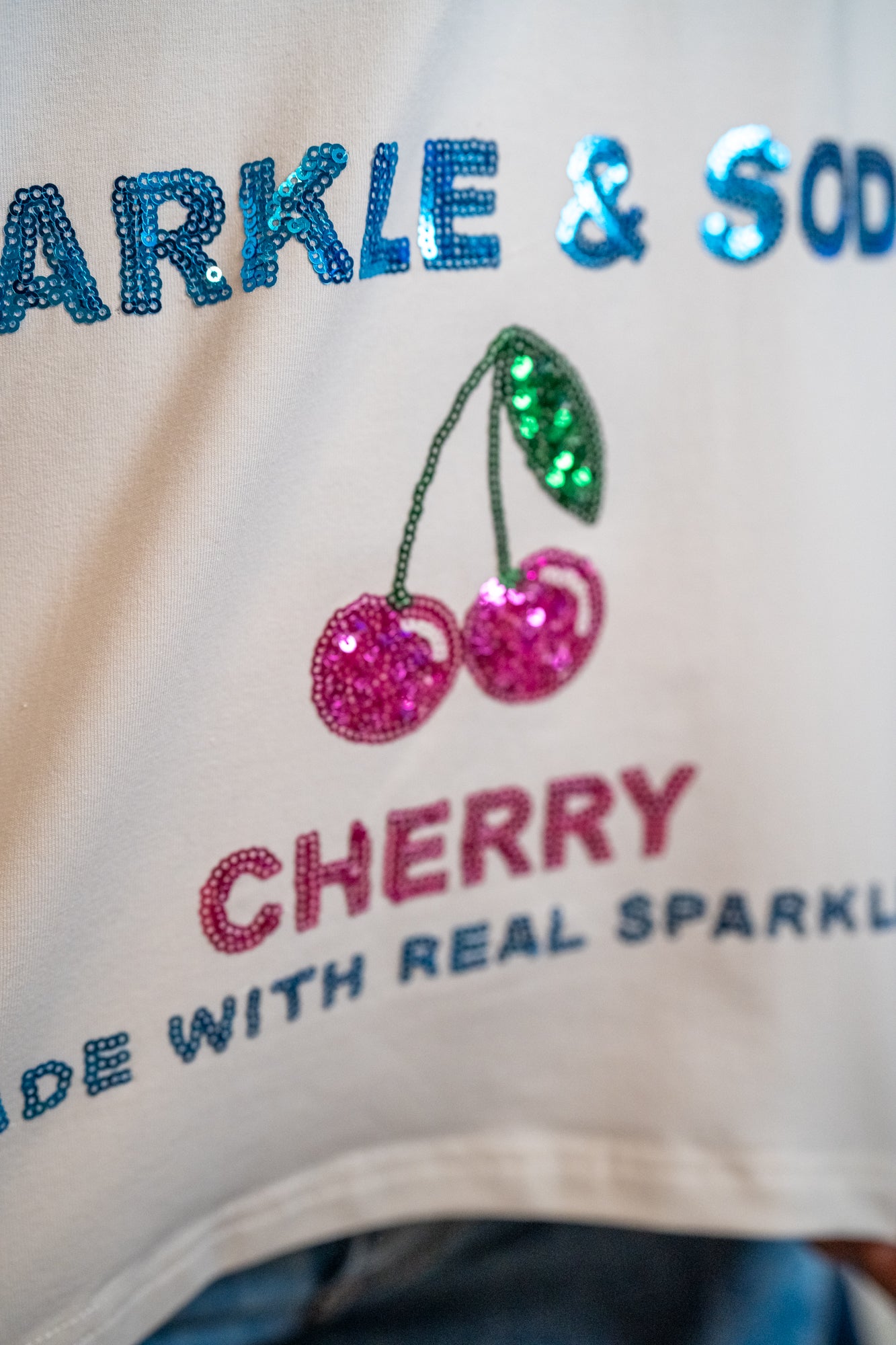 Sequin “Sparkle & Soda” text with cherry detail