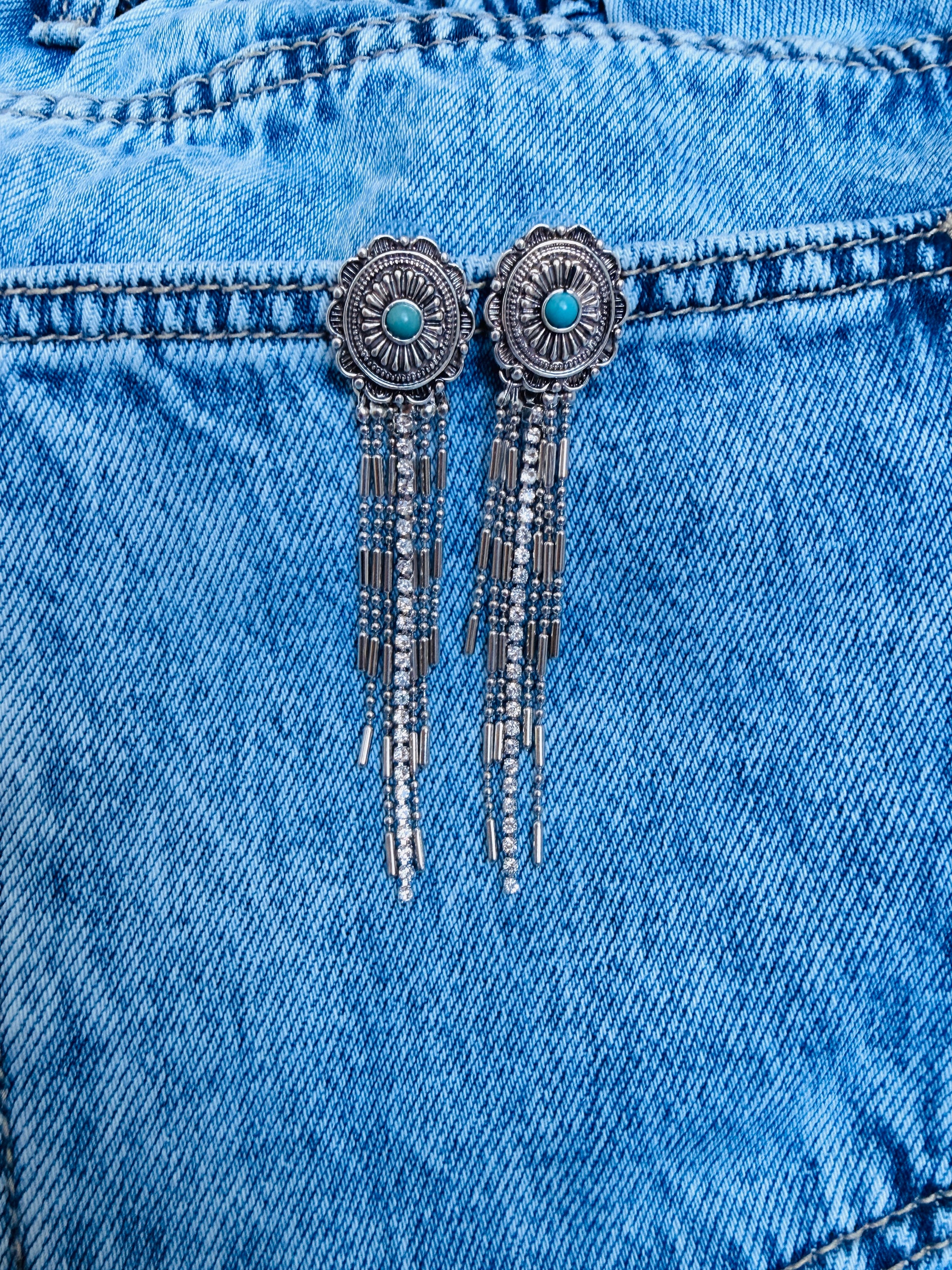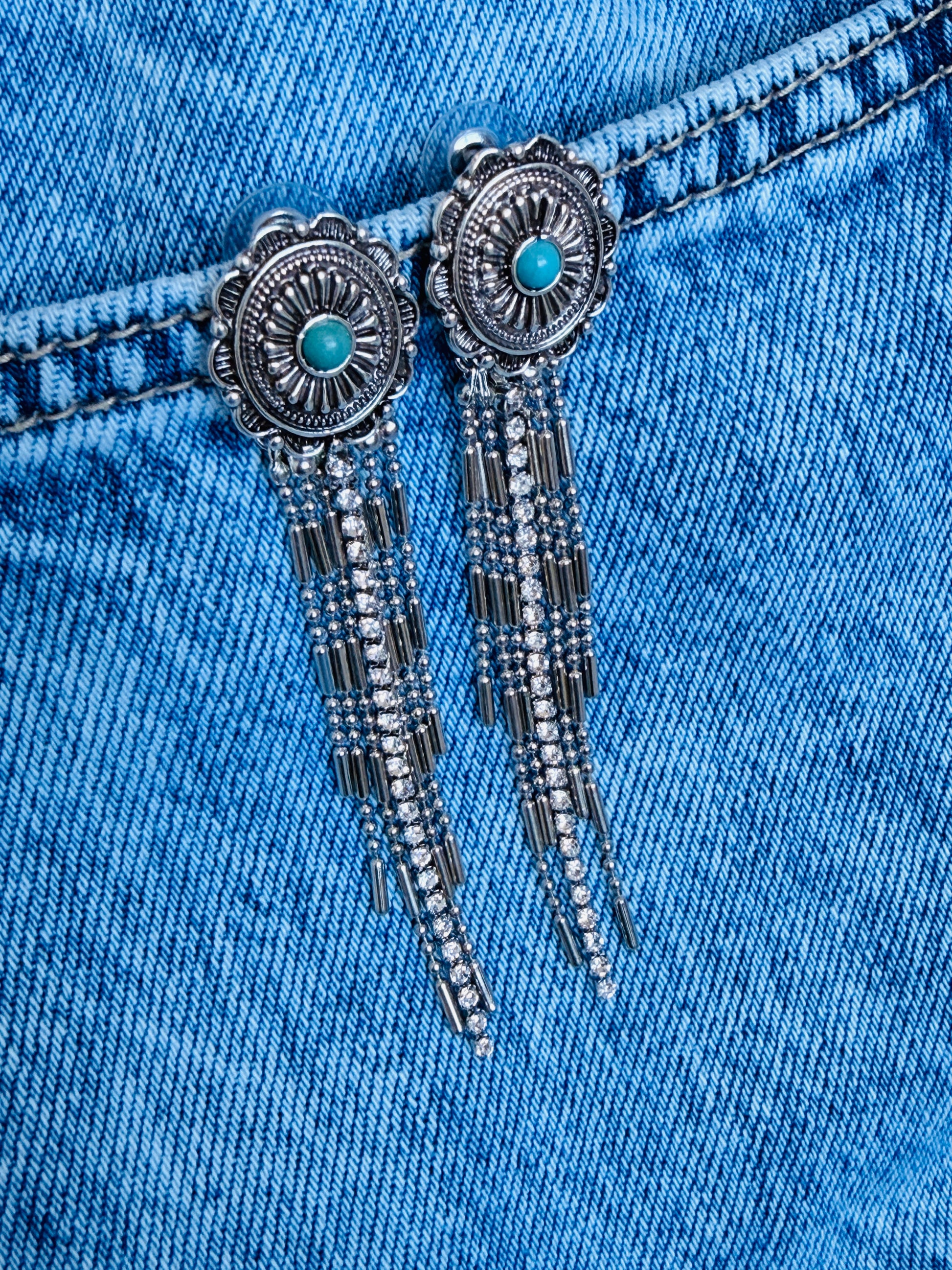 These antique silver beauties feature a detailed western concho design with a pop of turquoise in the center and long cascading tassels that catch the light every time you move. They bring that perfect mix of cowgirl energy and everyday glam — whether you're throwing on denim, a graphic tee, or heading out for a night with the girls.
